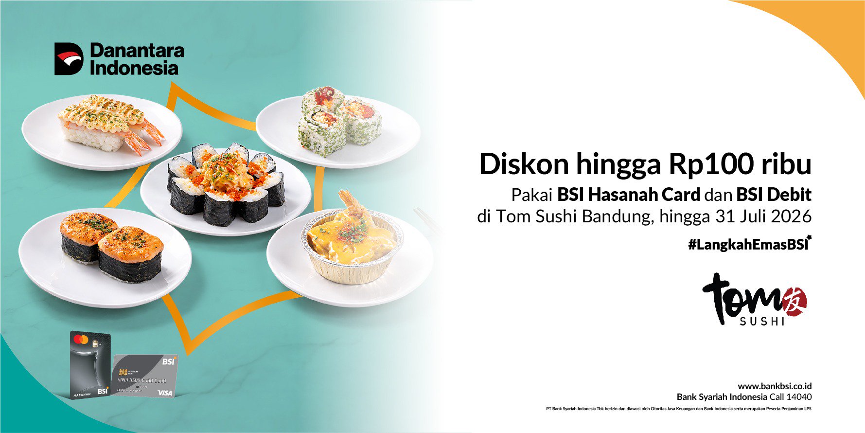 Diskon Hingga Rp100 Ribu di Tom Sushi Bandung Pakai BSI Hasanah Card & BSI Debit!