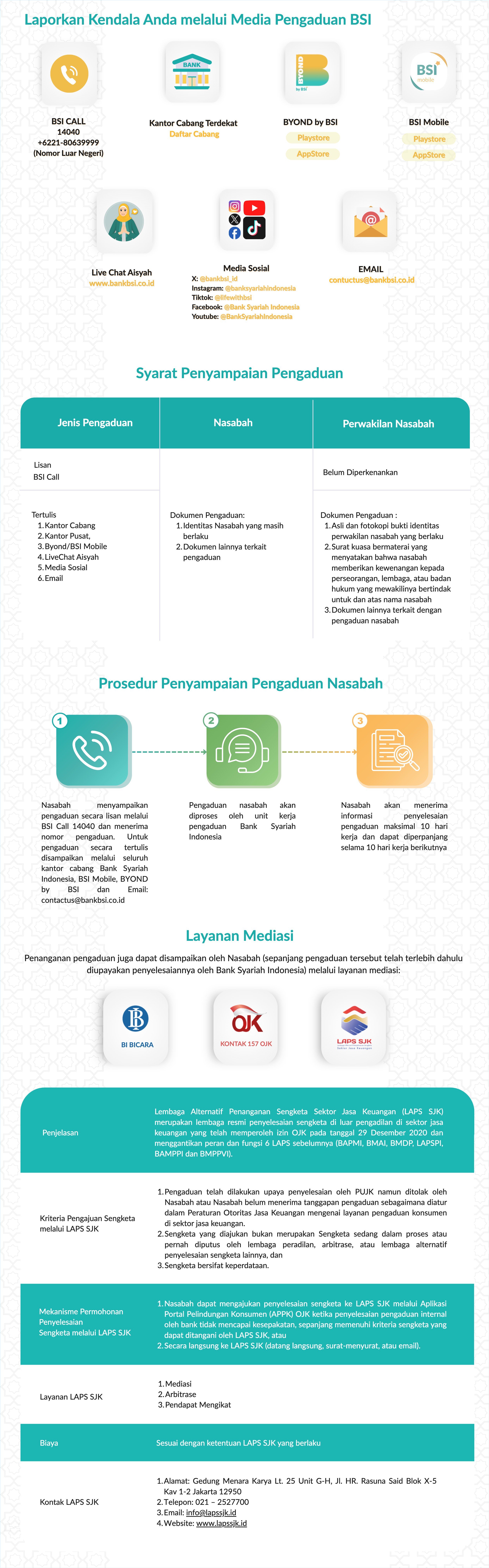 Bank Syariah Indonesia menyediakan sarana penyampaian pengaduan nasabah, baik secara lisan maupun tertulis.