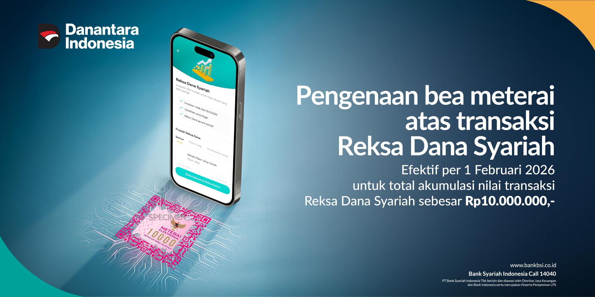 | 4. | Bagaimana cara pembayaran Bea Meterai? | Perhitungan besarnya Bea Materai yang dikenakan kepada masing-masing Investor akan dilakukan oleh PT Kustodian Sentral Efek Indonesia (KSEI). Pada saat tagihan Bea Materai diterima dari KSEI, maka pengenaan Bea Meterai pada Investor akan dilakukan  dengan cara pendebitan dari rekening Investor di BSI mulai bulan Maret 2026 atas transaksi yang dilakukan pada bulan Februari 2026. Pengenaan Bea Meterai ini akan efektif diberlakukan pada tanggal 01 Februari 2026 |