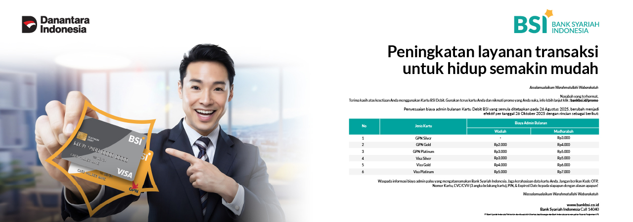 Informasi mengenai penyesuaian biaya administrasi bulanan Kartu Debit BSI disampaikan mulai tanggal 11 Juli 2025 melalui: