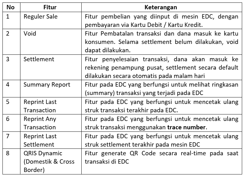 Alat elektronik yang digunakan oleh Merchant yang bekerja sama dengan Bank BSI untuk menerima transaksi pembayaran menggunakan Kartu ATM/Debit jaringan nasional (GPN), VISA, MasterCard, dan/atau QRIS (Domestik & Cross Border) BSI EDC sudah dapat menerima transaksi contact & contactless. |