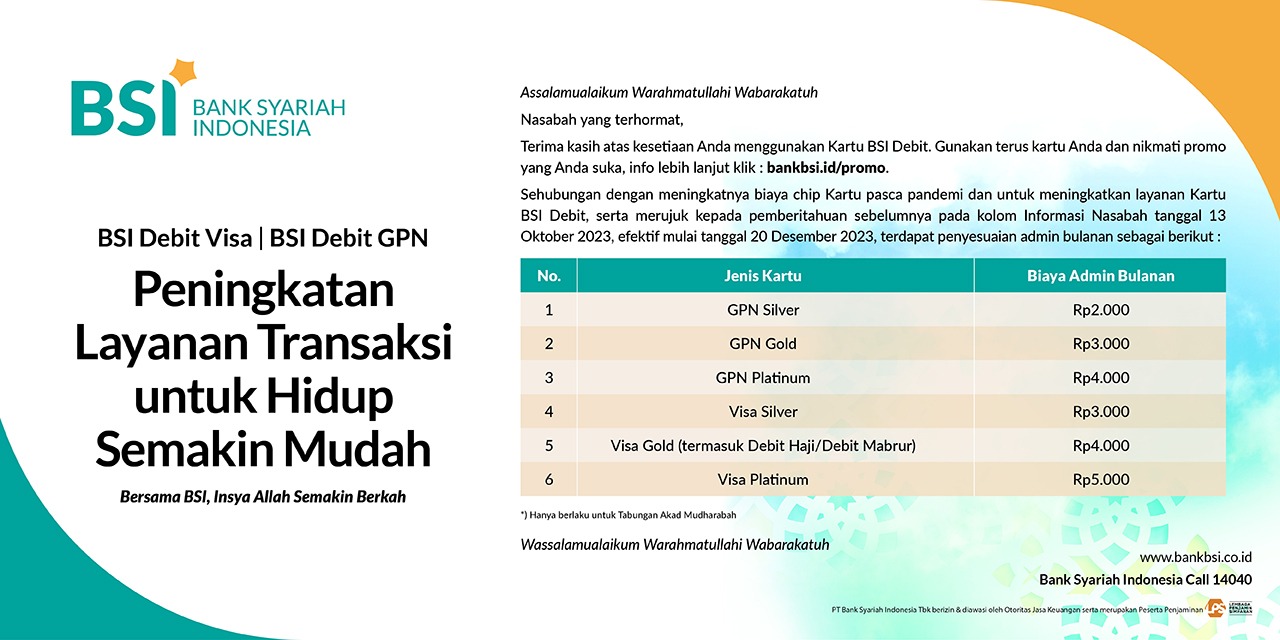 Update Penyesuaian Biaya Administrasi Bulanan Kartu Debit BSI