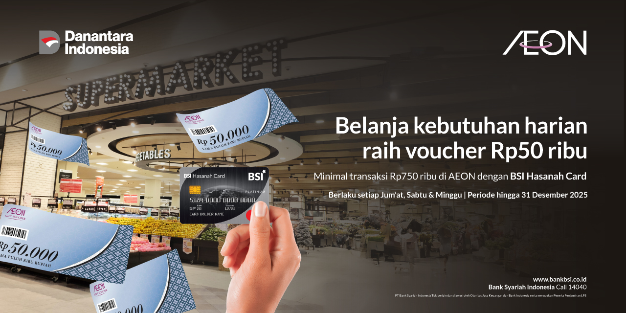 | Mekanisme Program | Free voucher dapat di redeem pada bagian Customer Service AEON Supermarket setelah nasabah melakukan transaksi dengan BSI Hasanah Card sesuai ketentuan program di atas |