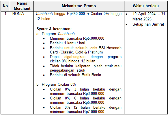 A : Promo BSI Card yang berlaku di Bonia adalah sebagai berikut: