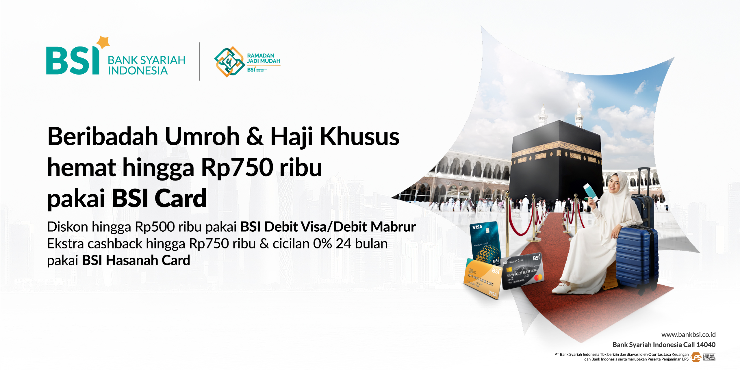 a. Program Cashback Travel Haji & Umroh Hasanah Card : b. Program Diskon Travel Haji & Umroh Debit Visa : • Transaksi pembelian Haji khusus dan Umroh menggunakan BSI Debit Visa/Mabrur |