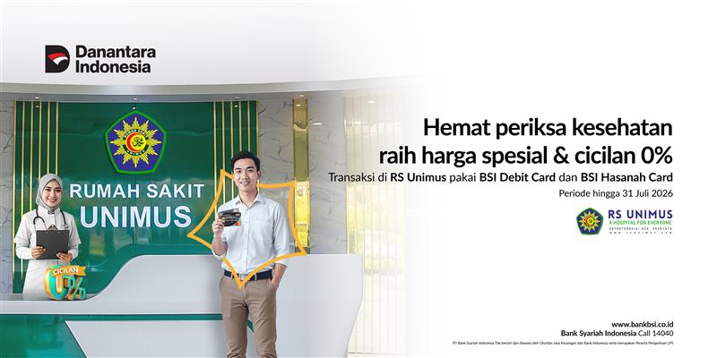 1. Promo Diskon Diskon memotong langsung nomimal transaksi sesuai mekanisme & syarat ketentuan program BSI CARD di RS Unimus Semarang 2. Promo Cicilan Cicilan dapat dilakukan dengan BSI Hasanah Card di mesin EDC BSI yang tersedia di RS Unimus Semarang