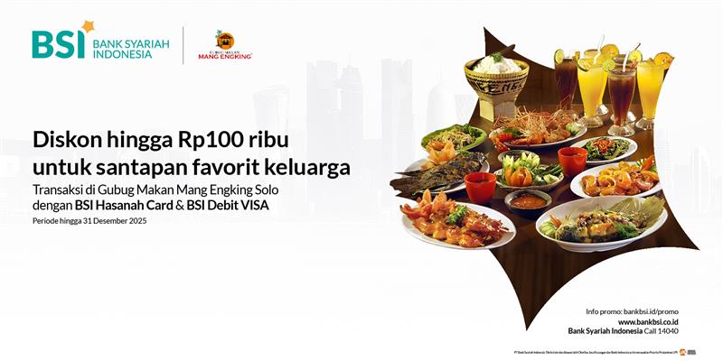 | 1. Q : Promo BSI apa saja yang sedang berlaku pada Gubug Mang Engking Solo saat ini? A : - BSI Debit : Diskon 5% sd Rp 100.000 BSI Hasanah Card : Diskon 10% sd Rp 100.000 2. Q : Berapa minimum transaksi untuk promo tersebut? A : Minimum transaksi Rp 300.000,- 3. Q : Apakah promo ini berlaku setiap hari? A : Ya, promo berlaku setiap hari selama periode promo 4. Q : Kartu BSI apa saja yang bisa digunakan untuk mendapatkan promo? A : BSI Hasanah Card dan BSI Debit VISA 5. Q : Kapan periode promo berlangsung ? A : hingga 31 Desember 2025 6. Q : Dimana letak outlet Gubug Mang Engking Solo ? A : Jl. A. Yani, Dusun IV, Pabelan, Kec. Kartasura, Surakarta, Jawa Tengah 7. Q : Apakah promo ini bisa digabung dengan promo lain? A : Promo ini tidak bisa digabung dengan promo lainnya. 8. Q : Apakah promo dapat diuangkan ? A : Promo tidak dapat diuangkan. 9. Q : Apakah ada batasan untuk menggunakan program promo ini : A : - Program promo dibatasi maksimal 1 transaksi / kartu / hari Program tidak berlaku kelipatan transaksi dan split bill 10. Q : Kapan produk promo diterima oleh nasabah? A : Diskon akan memotong nominal transaksi langsung ketika pemegang kartu melakukan pembayaran yang memenuhi syarat dan ketentuan program. |