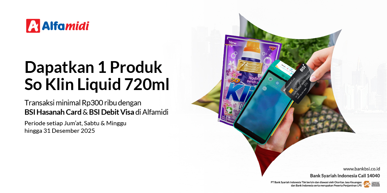 | Mekanisme Program | Free produk didapatkan setelah pemegang BSI Card melakukan transaksi di Alfamidi menggunakan BSI Hasanah Card/BSI Debit Visa sesuai syarat & ketentuan program. |
