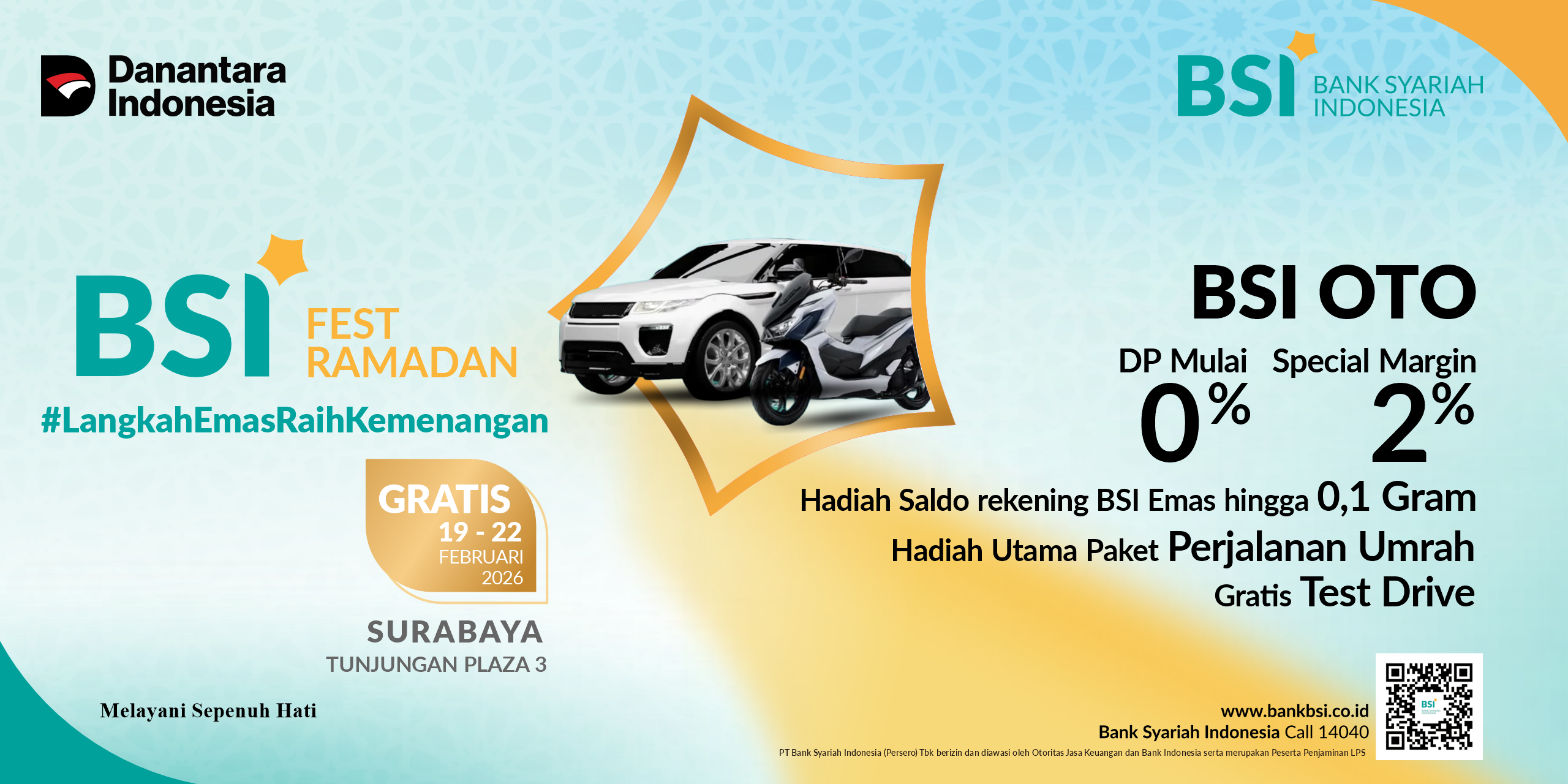 Event yang diselenggarakan oleh BSI dalam rangka menyambut Bulan Ramadhan dan Idul Fitri 2026 dengan mengusung tema Langkah Emas Ramadhan Fest 2026 #melayanisepenuhhati serta peran BSI sebagai: a. Sahabat Finansial Sahabat Financial Melalui Expo Produk dan Layanan BSI, Mengajak Beberapa Mitra, Meet n Greet Nasabah Prioritas Bersama Ustadz b. Sahabat Sosial Sahabat Sosial Melalui Kegiatan berbagi buka puasa & santunan anak yatim c. Sahabat Spiritual Sahabat Spiritual Melalui Kegiatan Berbagai Acara di Panggung Utama Meliputi: Tausiah, Lomba Islami (Hadroh/Marawis), Musik Religi |