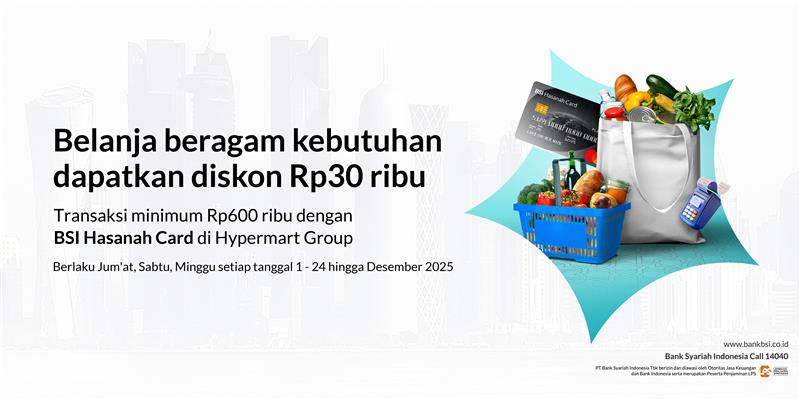 | Mekanisme Promo | Diskon langsung memotong nominal transaksi pembayaran sesuai syarat & ketentuan program BSI Hasanah Card di Hypermart Group. |
