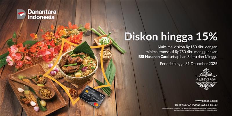 Diskon 15% hingga Rp 150 ribu menggunakan BSI Hasanah Card |