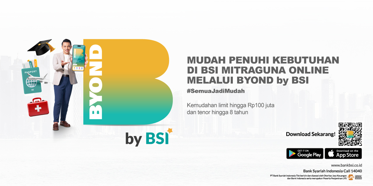 | 7. | Bagaimana cara pengajuannya? | Bila sudah mempunyai Byond By BSI, nasabah dapat meng-klik menu pembiayaan. Bila belum mempunyai Aplikasi Byond by BSI , nasabah bisa unduh dari Google Playstore atau App Store, kemudian lakukan aktivasi Byond by BSI, dan klik menu pembiayaan. Selanjutnya, nasabah tinggal mengikuti langkah-langkah didalam layanan mitraguna online |