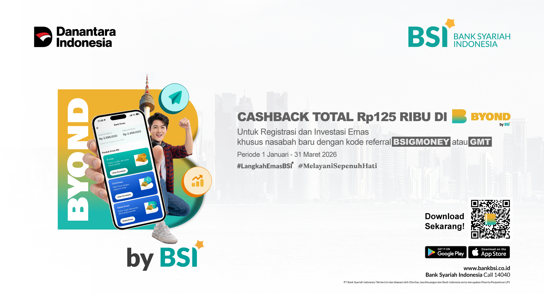 1 Promo ini berlaku untuk nasabah baru dengan cara pembukaan rekening online melalui BYOND by BSI dengan menggunakan kode referral BSIGMONEY atau GMT selama periode program.