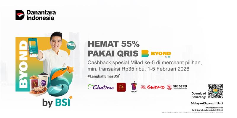 Cashback Spesial Milad ke-5 BSI di Merchant Pilihan - Hemat 55% Pakai Qris BYOND by BSI
