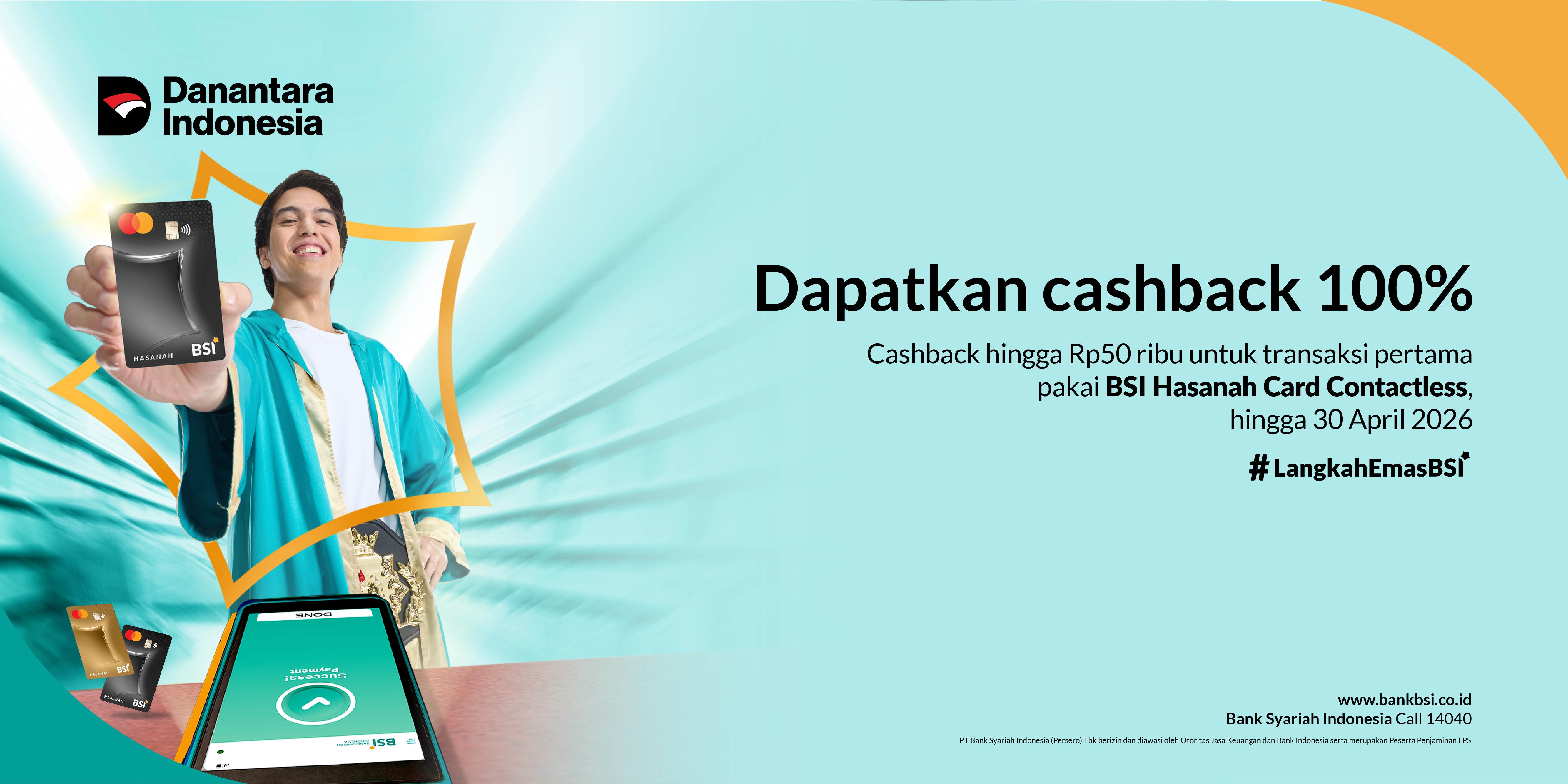 | Bentuk program | Cashback 100% hingga Rp 50.000,- untuk transaksi pertama menggunakan BSI Hasanah Card dengan metode contactless selama periode program. |