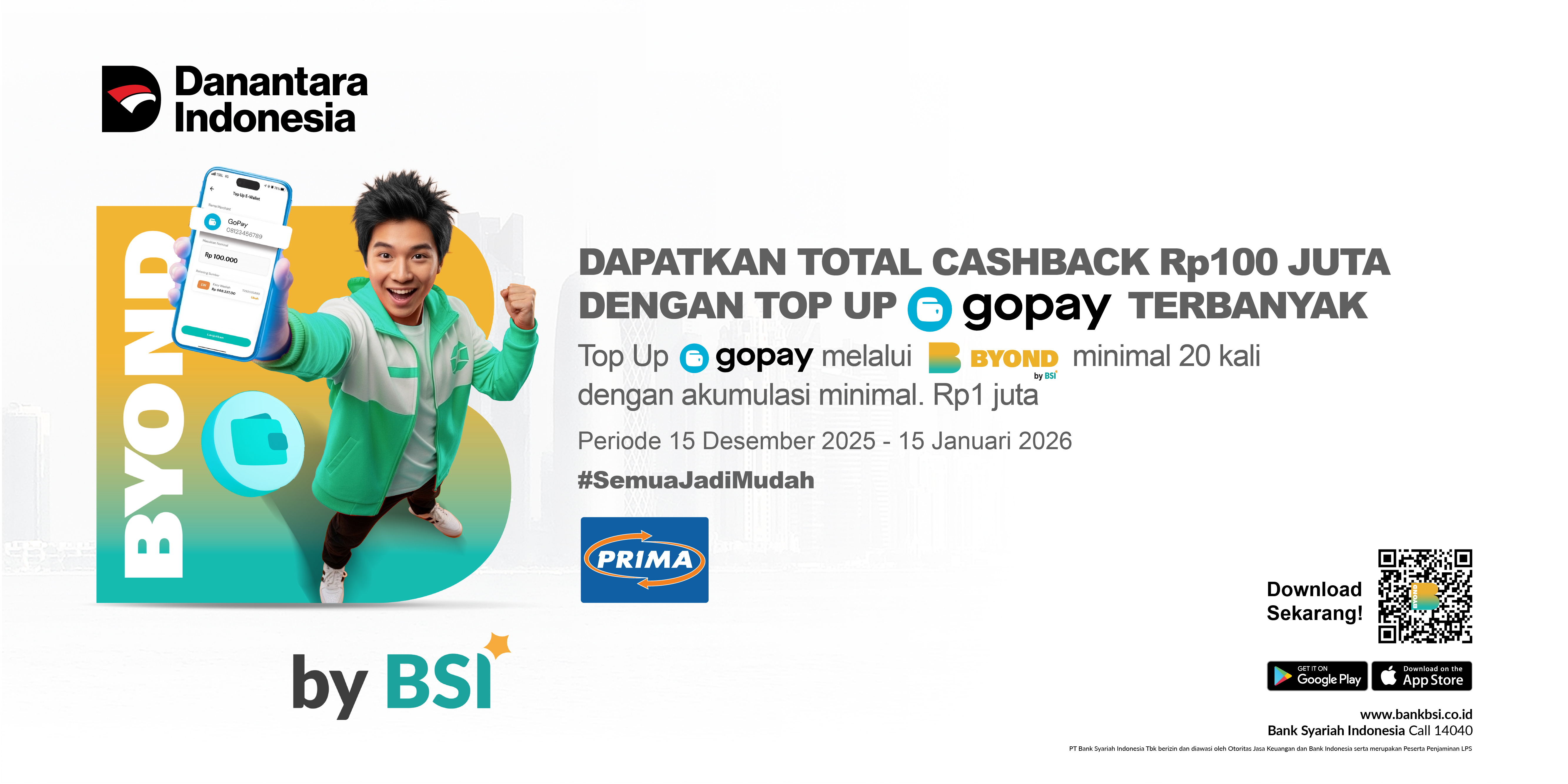 | 1 | Deskripsi Program | Program racing transaksi diperuntukkan bagi seluruh nasabah perorangan BSI yang berhasil bertransaksi terbanyak dan tercepat layanan top up Gopay melalui BYOND by BSI dengan minimal jumlah transaksi sebanyak 20 kali dengan akumulasi nominal minimal Rp1.000.000,- (satu juta rupiah) | ||||||||||||||||