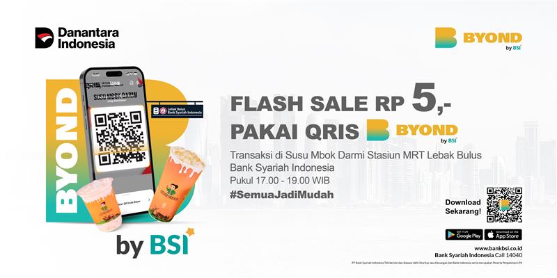 | 1 | Promo “Flash Sale Rp 5 – Susu Mbok Darmi” merupakan program promo untuk seluruh pengguna BYOND by BSI yang melakukan transaksi di merchant Susu Mbok Darmi Cabang Stasiun MRT Lebak Bulus Bank Syariah Indonesia. |