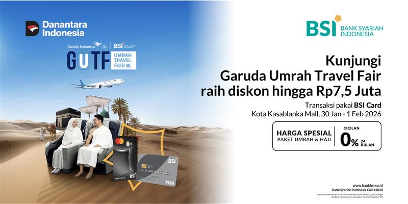 1. Kunjungi kantor cabang BSI terdekat. 2. Kunjungi booth BSI di event Garuda Indonesia Travel Fair di Mall Kasablanka A (30 Jan – 1 Februari 2026). |