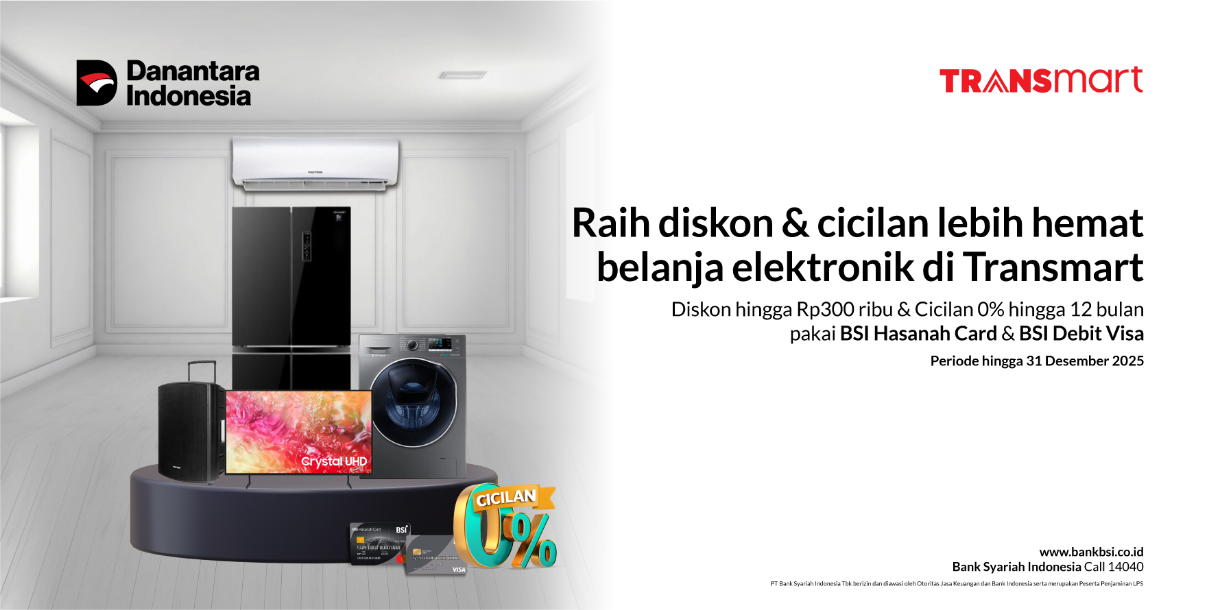 | Mekanisme Program | Diskon akan memotong nominal secara langsung ketika pemegang kartu melakukan pembayaran sesuai syarat dan ketentuan program di store Transmart dengan menggunakan BSI Card. |