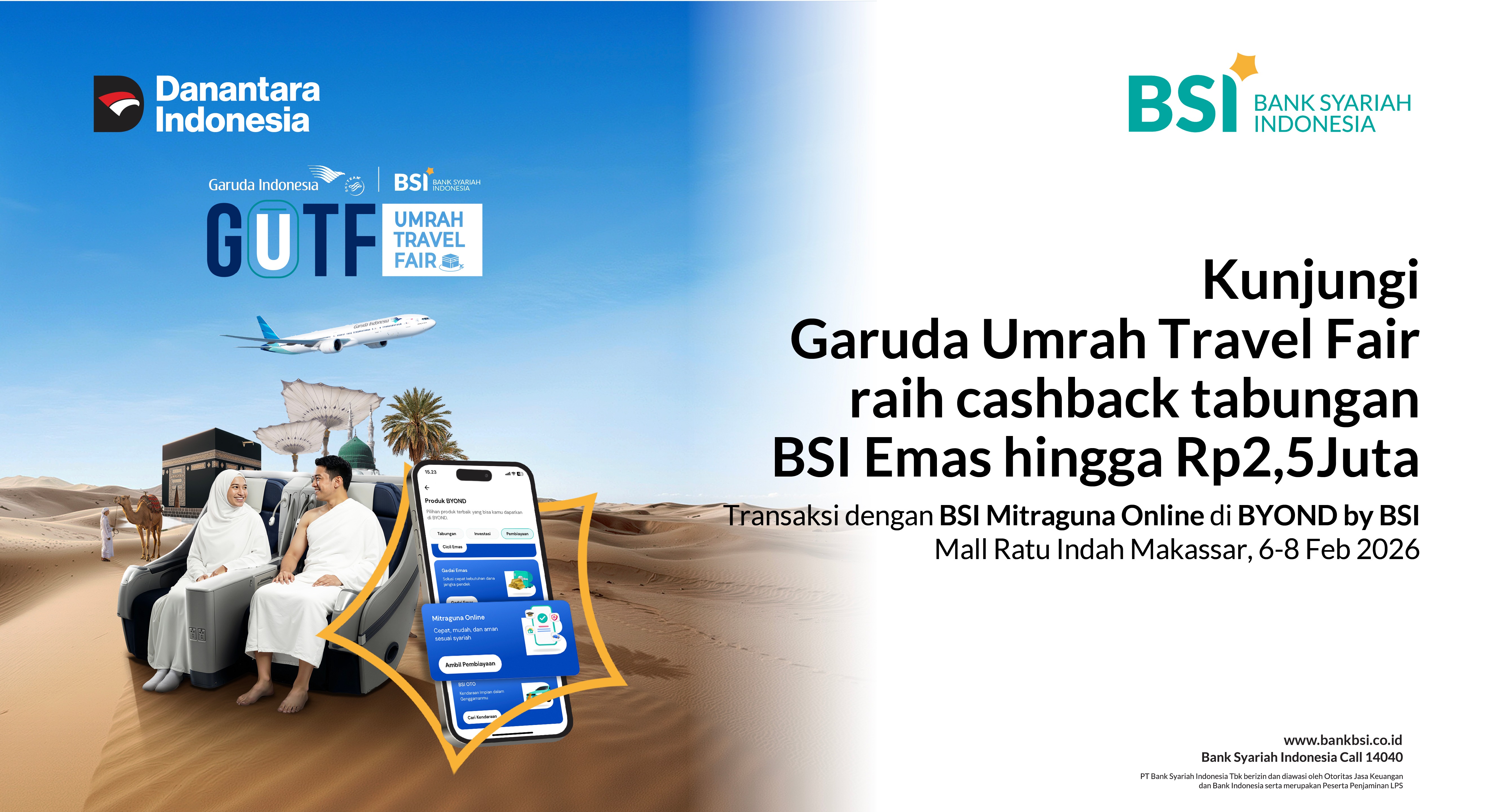 | 2. | Siapakah segmen peserta yang berhak mendapatkan promo ini? | Nasabah pencairan pembiayaan Mitraguna Berkah atau Mitraguna Online dengan tujuan pembelian Paket Umroh atau Porsi Haji Khusus atau Paket Haji Khusus pada masa periode program GUTF. |