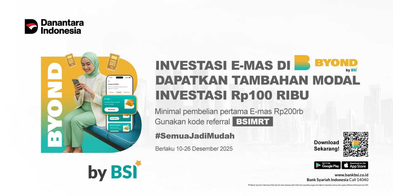 | 2. | Program ini berlaku untuk nasabah eksisting yang melakukan pembukaan rekening e-mas melalui BYOND by BSI dengan kode referral BSIMRT dengan pembelian pertama minimal sebesar Rp 200.000,- selama periode program (tidak berlaku akumulasi) |