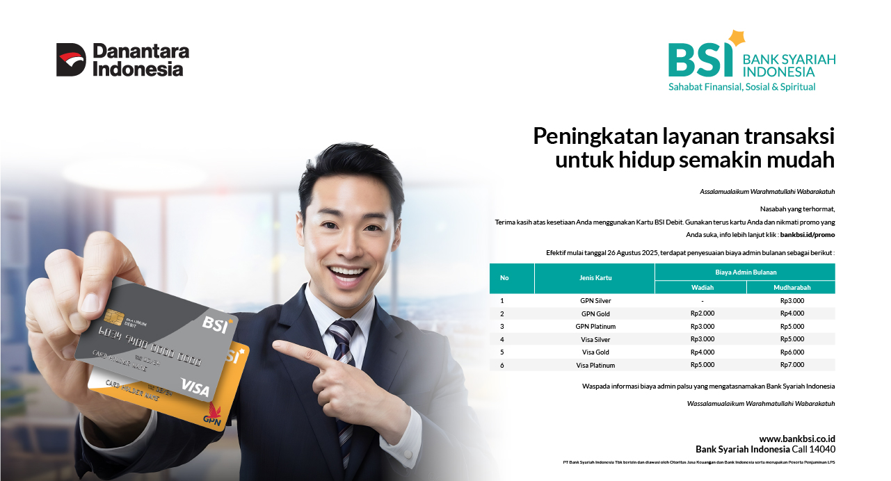 | 4. | Kapan penyesuaian biaya admin ini mulai diberlakukan? | Penyesuaian biaya ini berlaku terhitung mulai tanggal 26 Agustus 2025 dan seterusnya bagi pengguna Kartu Debit BSI baik Visa maupun GPN untuk nasabah Tabungan Akad Wadiah dan Mudharabah. |