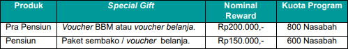 | 4 | Bagaimana mekanisme pemberian hadiah? | Special gift dapat diberikan secara langsung dari Cabang kepada Nasabah selama memenuhi ketentuan |