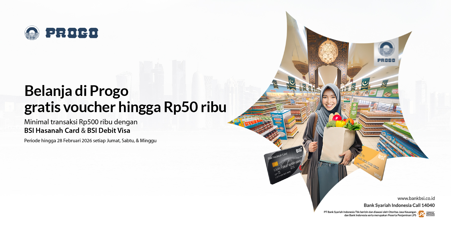 | Mekanisme Promo | Voucher akan diberikan di bagian customer service setelah pemegang kartu melakukan pembayaran sesuai syarat dan ketentuan program di store Progo Mart Yogyakarta dengan menggunakan BSI Card. |
