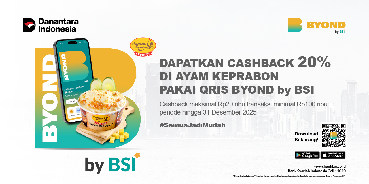 Promo berlaku bagi nasabah BSI dengan minimal transaksi pembelian minimal Rp100.000,- di outlet Ayam Keprabon, akan mendapatkan cashback 20% (maksimal cashback Rp20.000,-) dengan pembayaran menggunakan fitur QRIS di BYOND by BSI dan scan QRIS di BSI EDC.