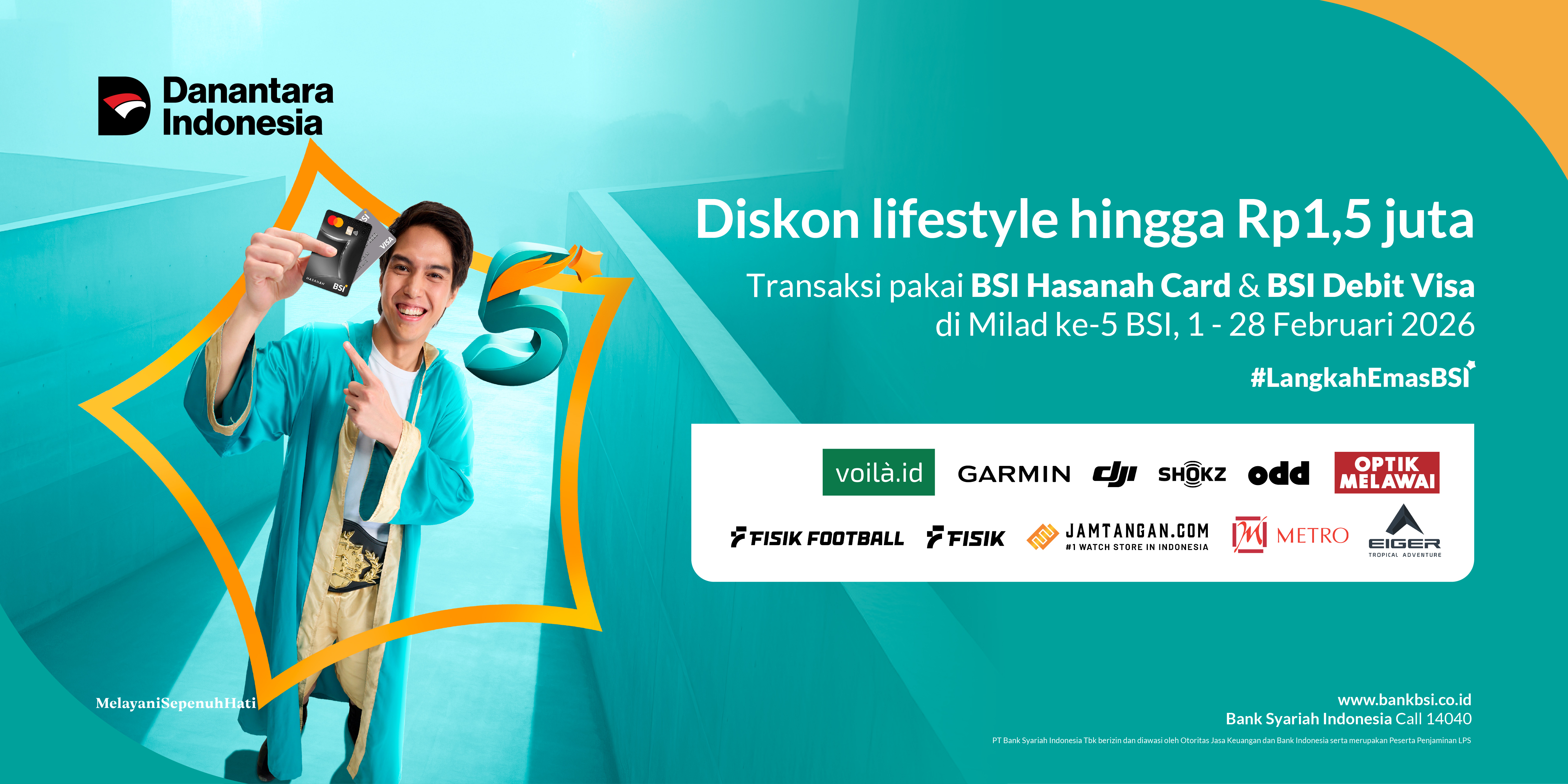 BSI Hasanah Card dan : Diskon Rp 75 ribu minimal transaksi Rp 500 ribu BSI Debit Visa Card : Diskon Rp 50ribu minimal transaksi Rp 500 ribu