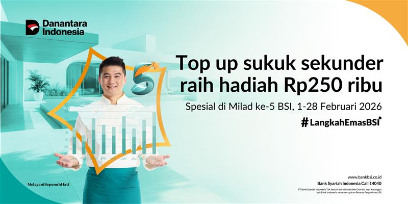 | Program ini berlaku bagi nasabah Bank Syariah Indonesia yang melakukan top-up kepemilikan Sukuk yang telah dimiliki sebelumnya melalui transaksi Sukuk di Pasar Sekunder. | |