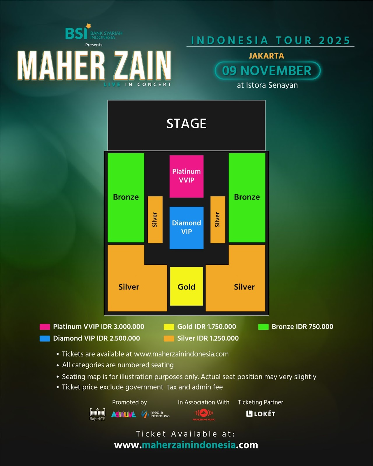 Tiket resmi dijual secara online melalui platform promotor dengan beberapa harga, yaitu Bronze, Silver, Gold, VIP dan VVIP. Disarankan segera melakukan pemesanan, karena diperkirakan peminatnya yang tinggi.