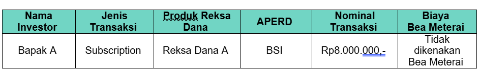 Bapak A melakukan transaksi pembelian (subscription) produk Reksa Dana A melalui APERD BSI dengan nominal Rp8.000.000,-, maka berapakah Bea Meterai yang dikenakan kepada Bapak A?