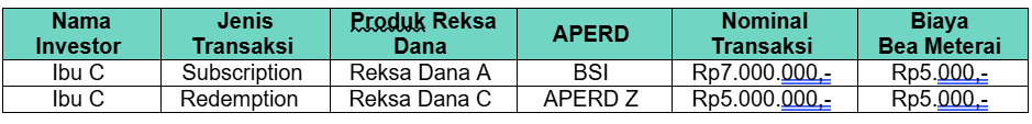 Ibu C melakukan transaksi pembelian (subscription) produk Reksa Dana A melalui APERD BSI dengan nominal Rp7.000.000,- dan transaksi penjualan (redemption) produk Reksa Dana B melalui APERD X pada hari yang sama, maka berapakah Bea Meterai yang dikenakan kepada Ibu C?