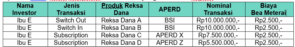 Ibu E melakukan transaksi pengalihan (switching) dari produk Reksa Dana A menjadi produk Reksa Dana B melalui APERD BSI dengan nominal Rp10.000.000,-. Lalu di hari yang sama, Ibu E juga melakukan pembelian (subscription) produk Reksa Dana C melalui APERD X dengan nominal Rp7.500.000,- dan produk Reksa Dana D melalui APERD Z dengan nominal Rp5.500.000,-, maka berapakah Bea Meterai yang dikenakan kepada Ibu E?