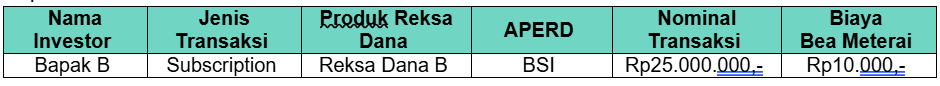 Bapak B melakukan transaksi pembelian (subscription) produk Reksa Dana B melalui APERD BSI dengan nominal Rp25.000.000,-, maka berapakah Bea Meterai yang dikenakan kepada Bapak B?