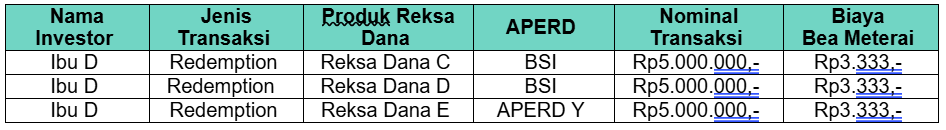 Ibu D melakukan transaksi penjualan (redemption) produk Reksa Dana C dengan nominal Rp5.000.000,- dan produk Reksa Dana D Rp5.000.000,- melalui APERD BSI, kemudian Ibu D kembali melakukan transaksi penjualan (redemption) produk Reksa Dana E dengan nominal Rp5.000.000 melalui APERD Y pada hari yang sama, maka berapakah Bea Meterai yang dikenakan kepada Ibu D?