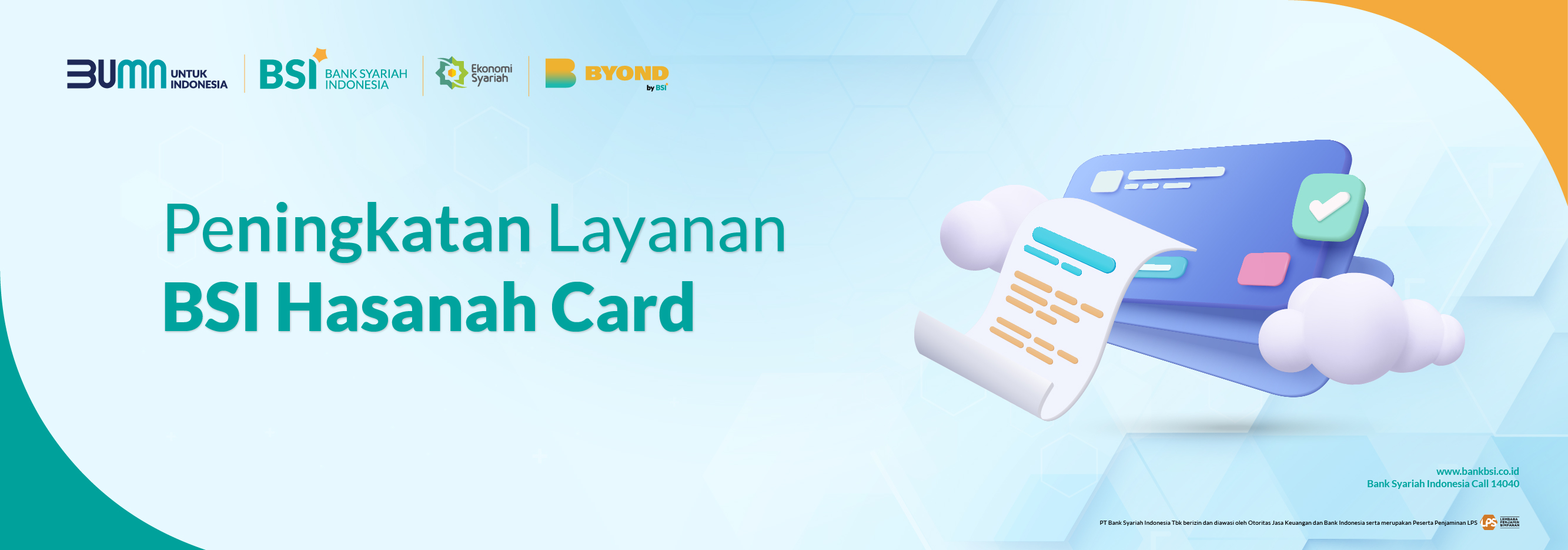 Nasabah yang terhormat, BSI selalu berupaya meningkatkan layanan untuk nasabah. Per tanggal 19 Januari 2025, nikmati improvement layanan BSI Hasanah Card melalui Channel BSI untuk kemudahan Anda, sebagai berikut: