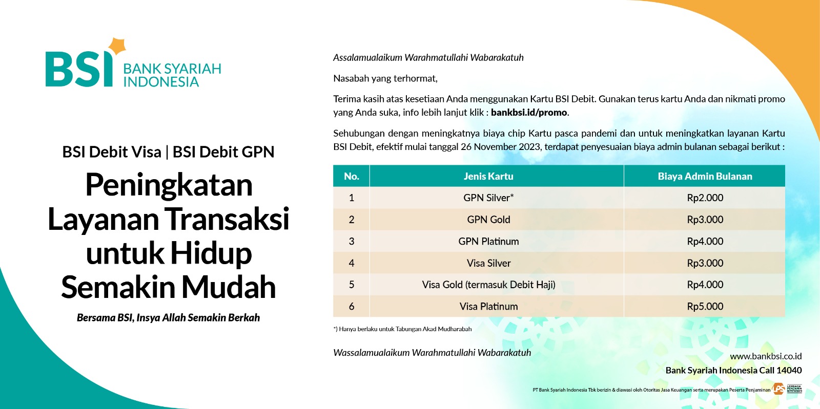 Penyesuaian Biaya Administrasi Bulanan Kartu Debit BSI