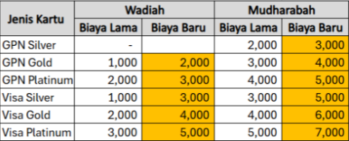 10 | Perubahan biaya admin kartu apakah merubah biaya limit transaksi per Nasabah? (Contoh semula per transaksi tarik tunai 15 juta per hari menjadi 20 juta per hari) | Tidak ada perubahan |