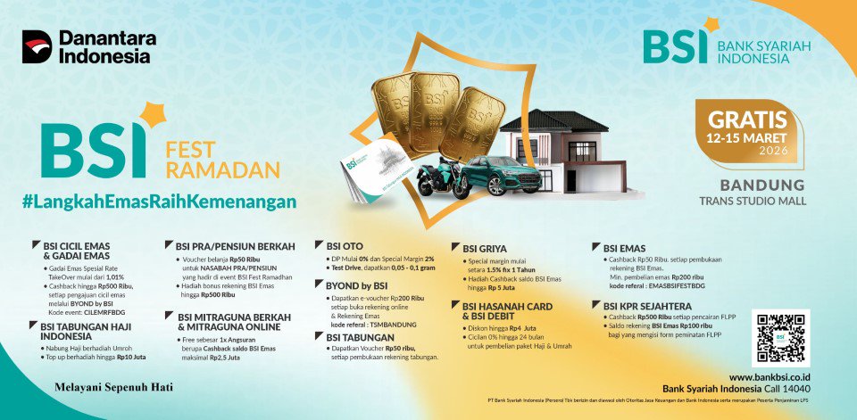 BSI Fest Ramadan bertema #LangkahEmasRaihKemenangan menjadi wujud komitmen BSI sebagai Sahabat Finansial, Sosial, dan Spiritual dalam mendampingi masyarakat menjalani Ramadan yang lebih bermakna baik secara rohani maupun finansial.