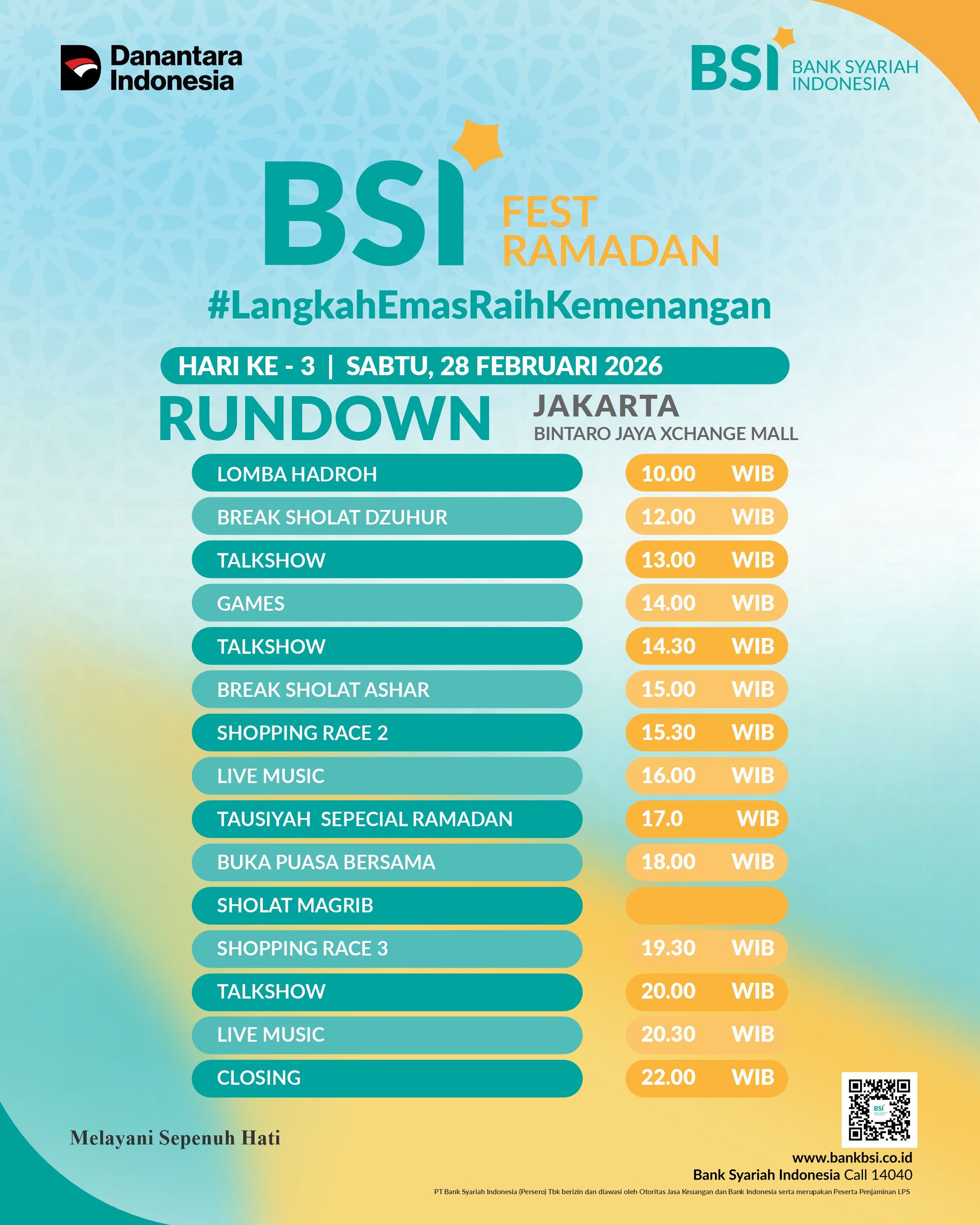Selain rangkaian kegiatan utama tersebut, BSI Fest Ramadan juga menghadirkan berbagai aktivitas tambahan seperti live shopping, lomba-lomba bernuansa Islami, serta pameran kendaraan yang melengkapi pengalaman Ramadan bagi seluruh pengunjung.