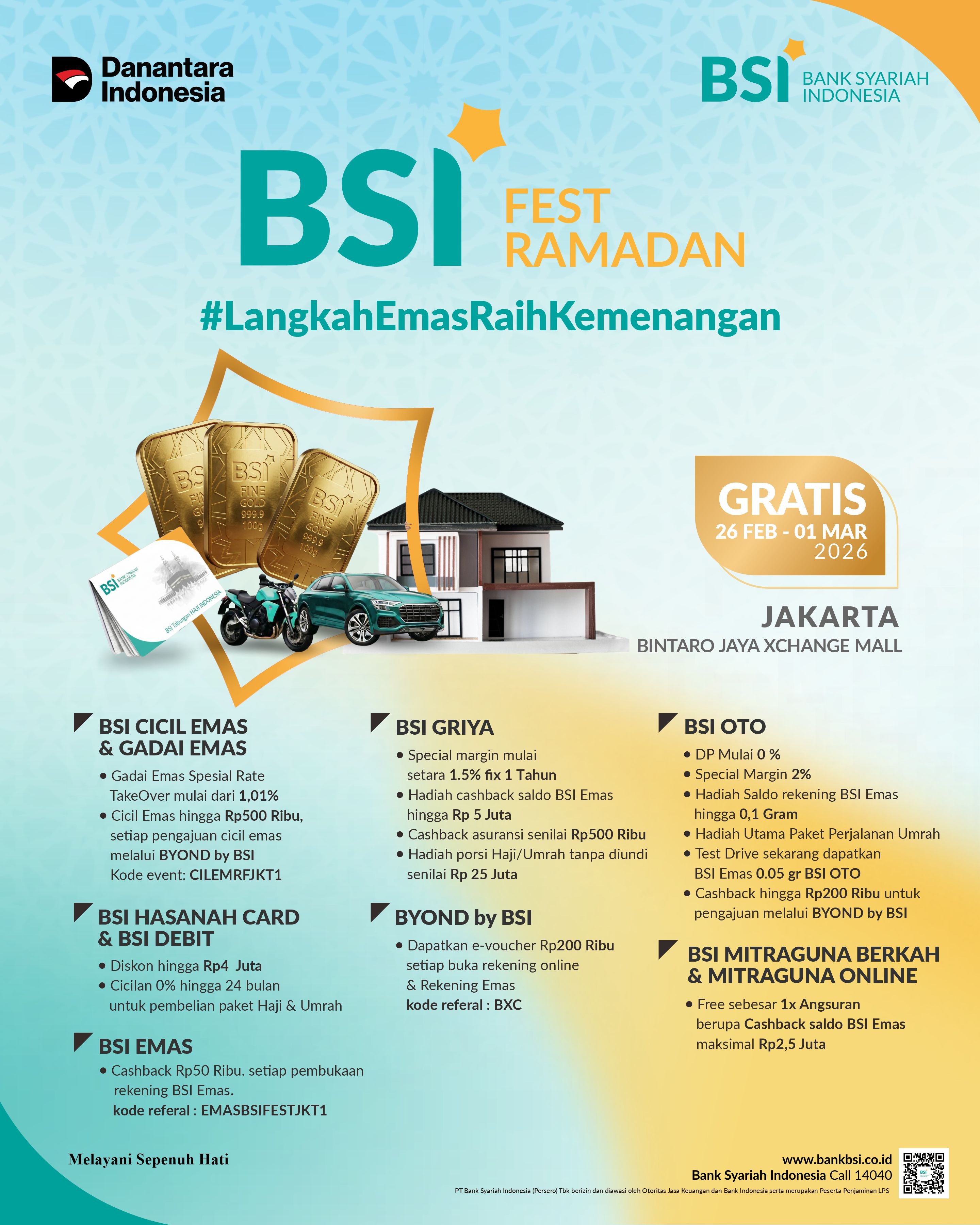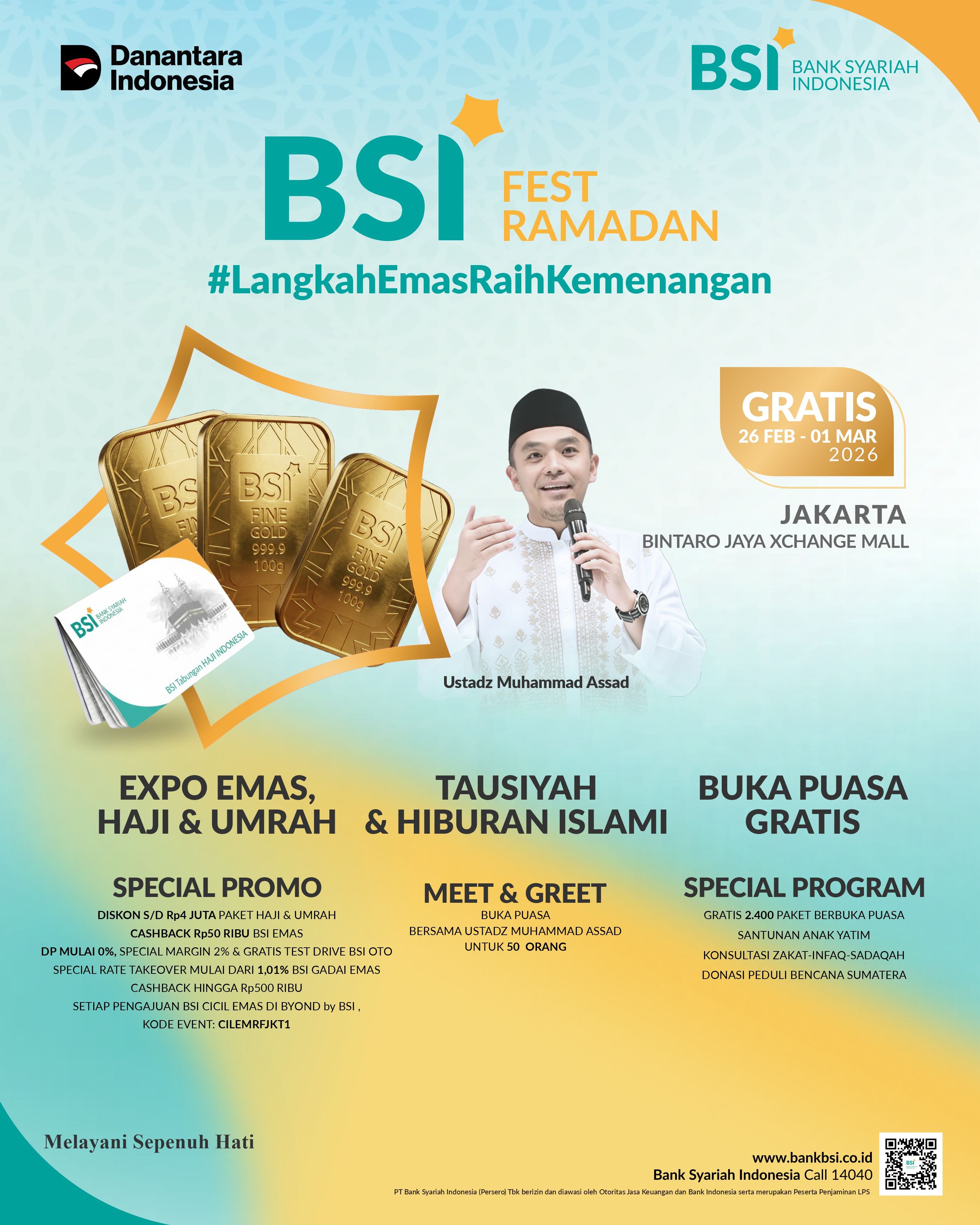BSI Fest Ramadan bertema #LangkahEmasRaihKemenangan menjadi wujud komitmen BSI sebagai Sahabat Finansial, Sosial, dan Spiritual dalam mendampingi masyarakat menjalani Ramadan yang lebih bermakna baik secara rohani maupun finansial.