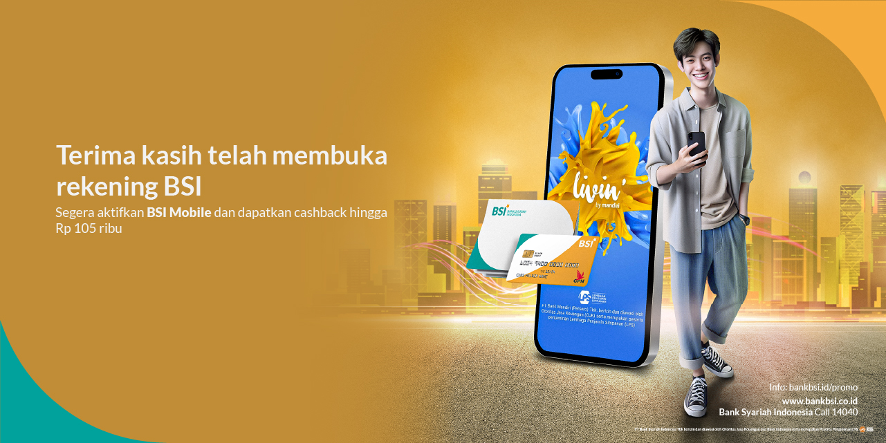 1. Program ini hanya berlaku untuk nasabah COO BSI via Livin yang belum melakukan aktivasi BSI Mobile yang menerima WAB atau Email 2. Bagi nasabah yang melakukan aktivasi dan minimal 1x transaksi finansial di BSI Mobile (kecuali transfer sesama BSI) selama periode berlangsung akan mendapatkan cashback sebesar Rp.30.000,- 3. Nasabah yang memenuhi syarat pada poin 1 akan mendapatkan extra cashback sampai dengan Rp.75.000 untuk 10x transaksi tertentu (Transfer,Qris, Payment, Top Up, Purchase) selama 3 bulan berikutnya dengan maksimal cashback perbulan sebesar Rp.25.000,- 4. Cashback maksimal Rp.105.000,- dengan rincian :