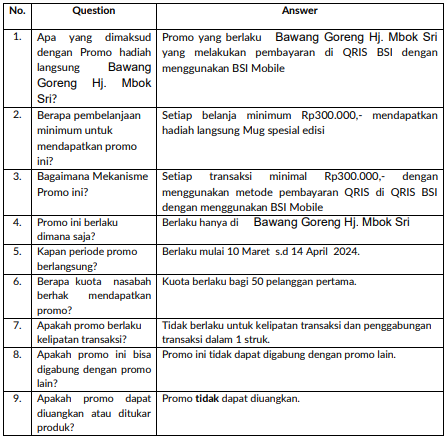 Promo ini berlaku untuk seluruh Pengguna yang melakukan metode pembayaran dengan menggunakan fitur QRIS BSI Mobile dan di scan pada stiker BSI QRIS di Bawang Goreng Hj. Mbok Sri pada saat bertransaksi.