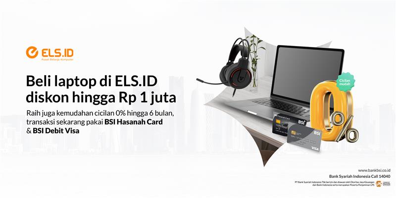 5. Nominal minimal transaksi untuk cicilan 0% adalah Rp 500 ribu (tidak mendapatkan diskon) 6. Berlaku untuk semua jenis BSI Hasanah Card (Classic, Gold, Platinum) dan BSI Debit Visa Card 7. Program dapat digabungkan dengan diskon dan promo lainnya (selain promo BSI) 8. Diskon berlaku untuk produk yang tersedia pada merchant dengan ketentuan principal yang berlaku 9. Diskon berlaku di seluruh store El’s Computer 10. Cicilan dapat dilakukan pada mesin EDC yang ditunjuk BSI (Yokke/ Mandiri) hingga EDC BSI sudah dapat di setting menu cicilan 11. Jika tidak digabungkan dengan cicilan 0% maka transaksi wajib dilakukan di mesin EDC BSI