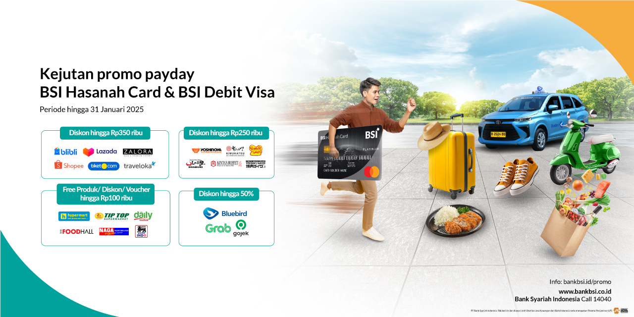 | Shopee | Diskon Rp100 ribu, min. transaksi Rp1.5 juta | - Diskon Rp100 ribu, min. transaksi Rp1.5 juta - Berlaku untuk seluruh jenis BSI Hasanah Card (Classic, Gold, Platinum) - Berlaku 1 user / hari - Berlaku dengan memasukkan kode voucher BSIPAYDAY - Periode promo berlaku tanggal 25 – 30/31 setiap bulan - Informasi selengkapnya: shopee.co.id/bsi |