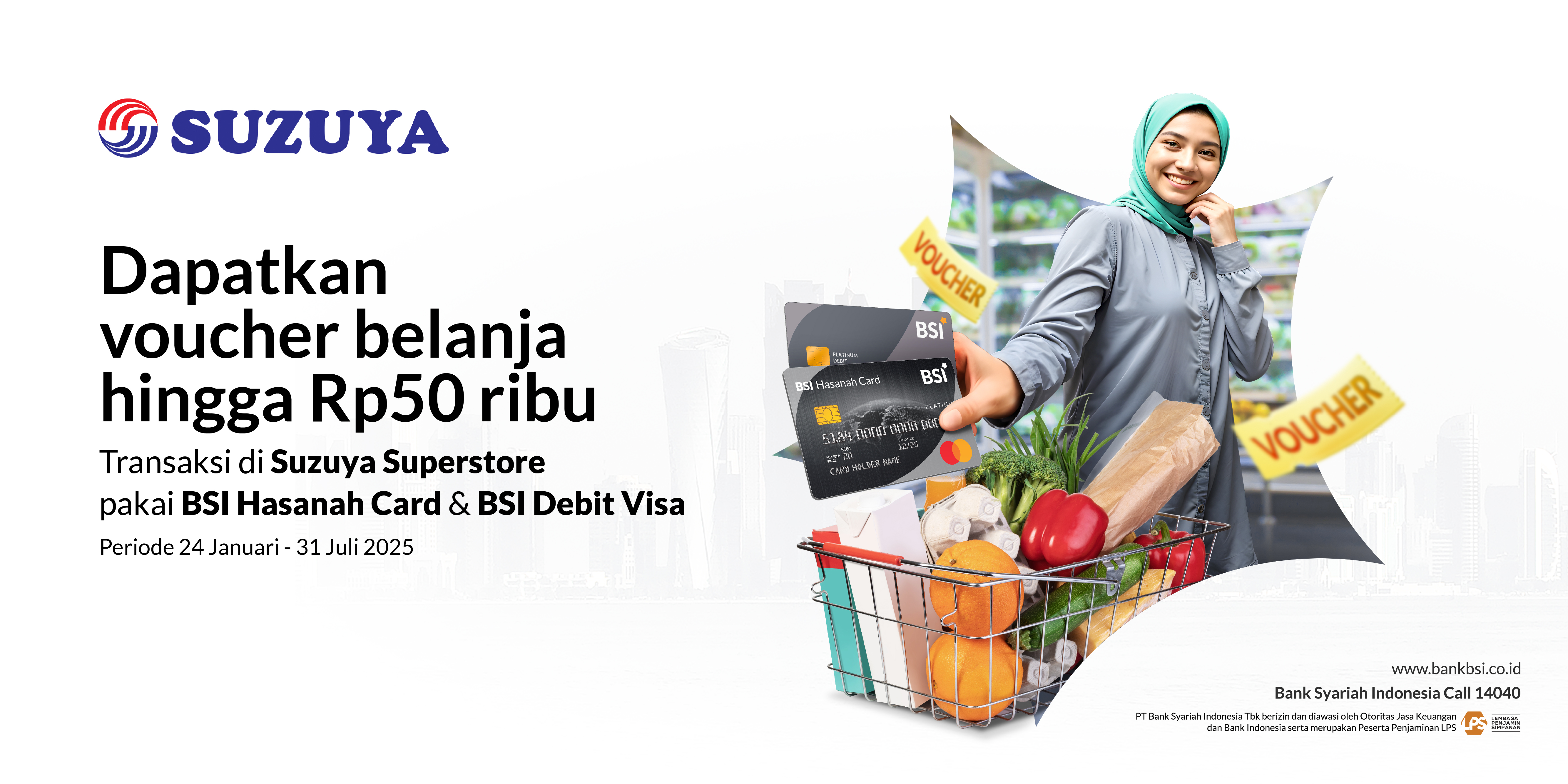 | Bentuk Program | - BSI Debit Visa Voucher Suzuya senilai Rp25 ribu (Berlaku Jum’at, Sabtu & Minggu) - BSI Hasanah Card Voucher Suzuya senilai Rp50 ribu (Berlaku Setiap Hari) |
