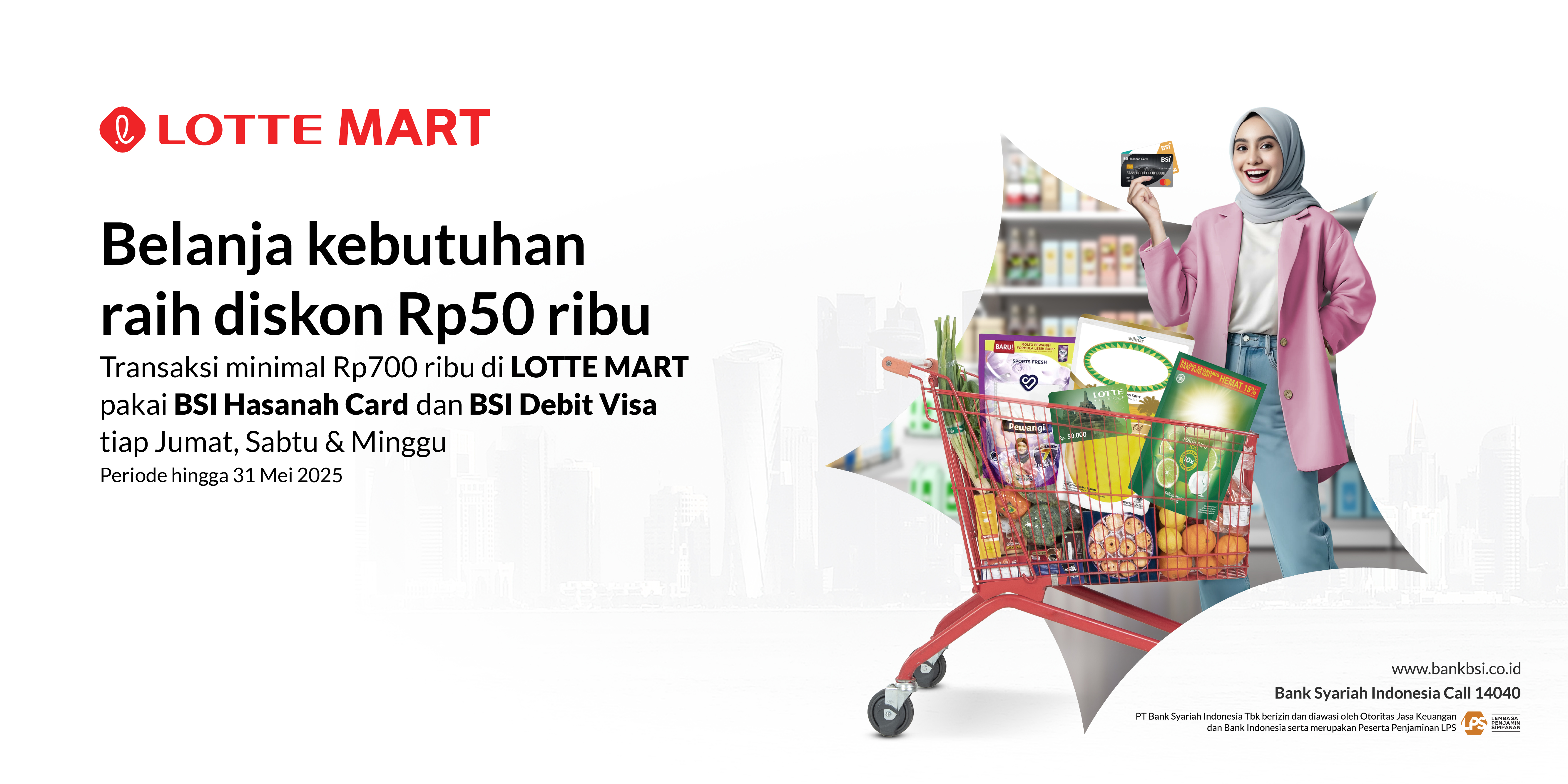 Promo BSI Card yang berlaku di Lotte Mart adalah diskon Rp 50.000 minimal transaksi Rp 700.000,-. |