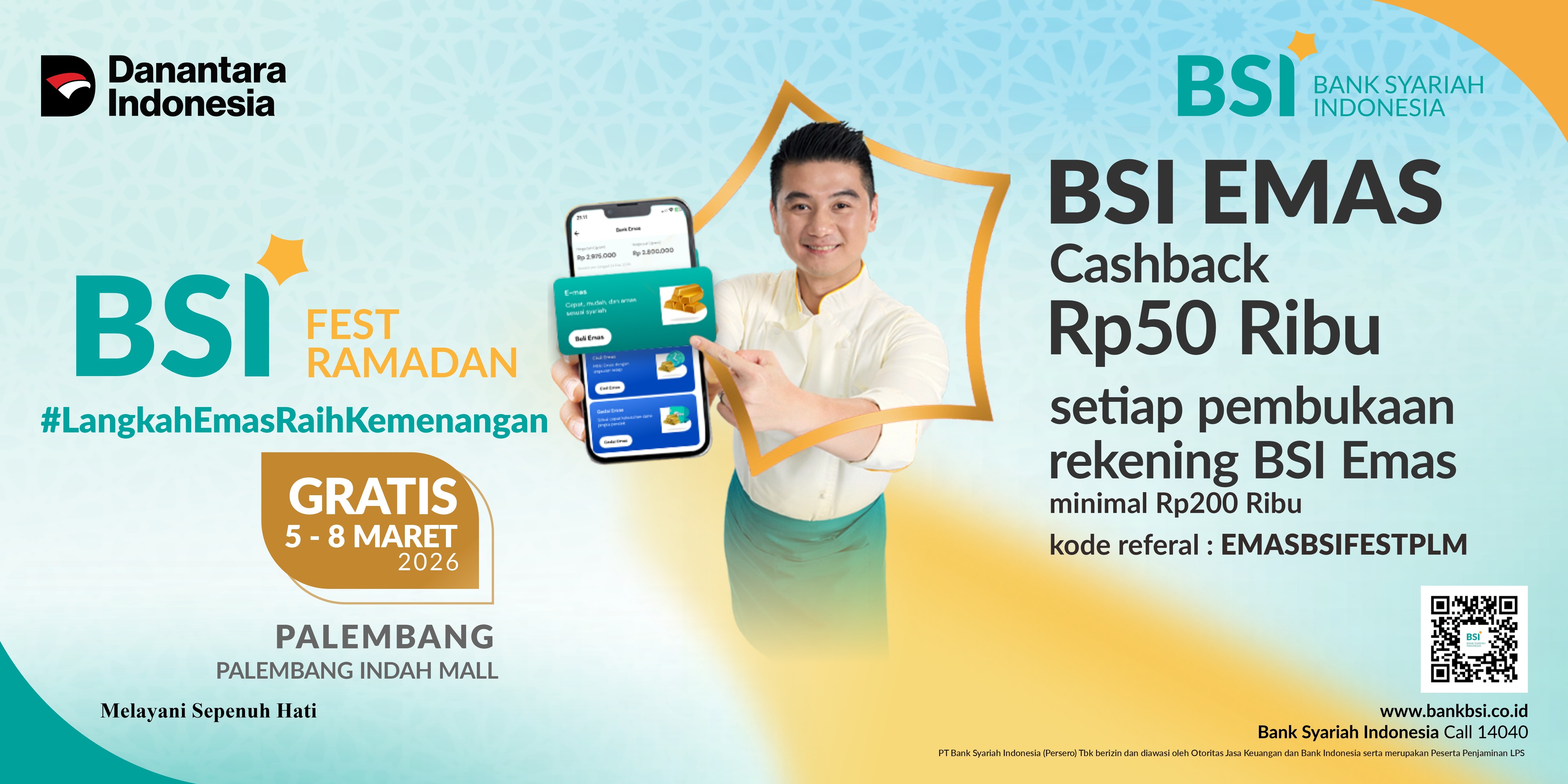 | Apakah kode referral wajib diinput? | Ya. Nasabah wajib menginput kode referral pada saat pembukaan rekening emas baru atau pada pembelian emas pertama selama event BSI Fest Ramadhan berlangsung agar transaksi terdaftar dalam program cashback. Kode referral berikut: EMASBSIFESTPLM *Transaksi tanpa input kode referral pada saat pembelian emas pertama tidak dapat diikutsertakan dalam program cashback. |